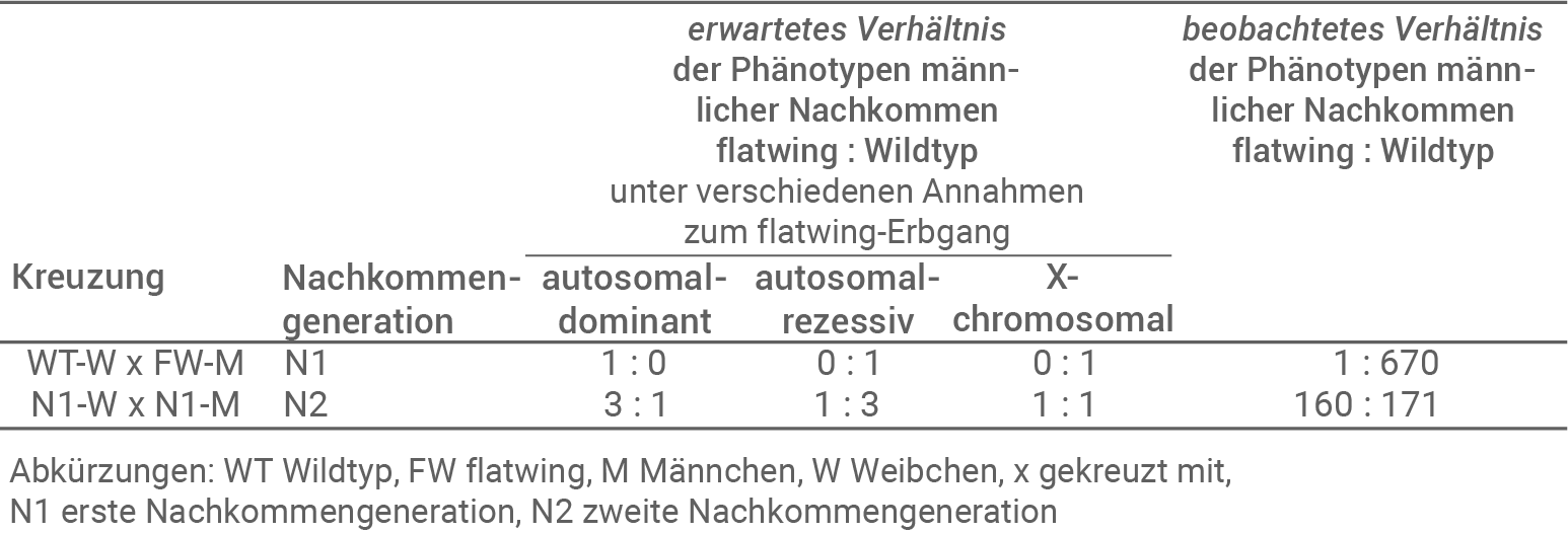 Nimmt man diesen Vererbungsgang an, so sollten in der ersten Nachkommengeneration nur Wildtyp-Nachkommen entstehen. In der zweiten Nachkommengeneration sollte sich dann ein 1:3 Verhältnis zwischen Flatwing und Wildtyp einstellen. - X-chromosomale Vererbung: