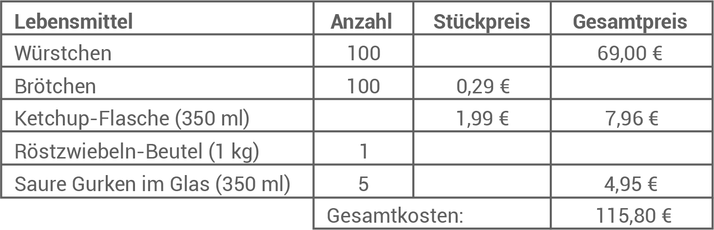 1. Rechnung: Stückpreis der Würstchen berechnen