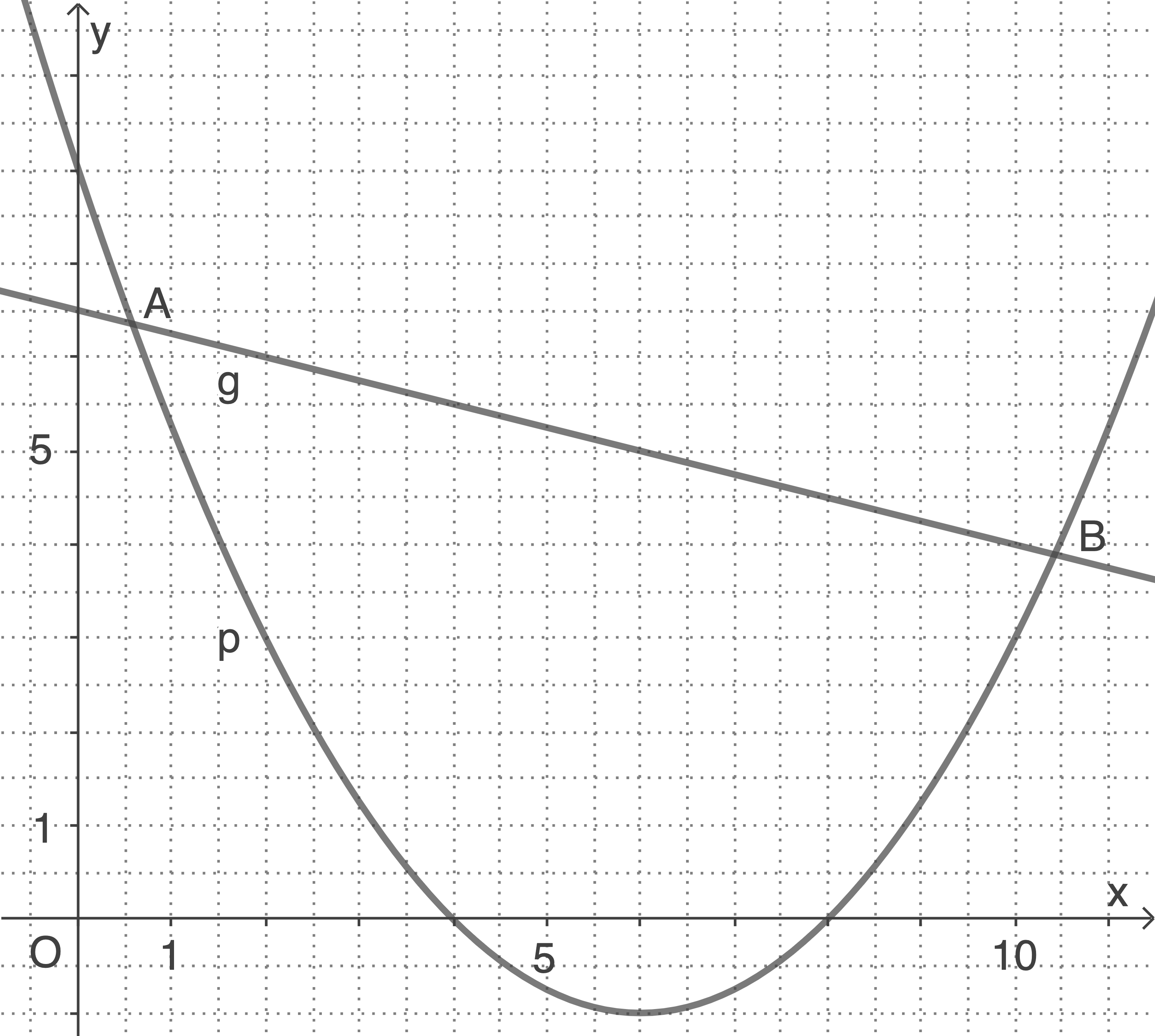 Die Punkte A und B sind die Schnittpunkte der Parabel p und der Gerade g.