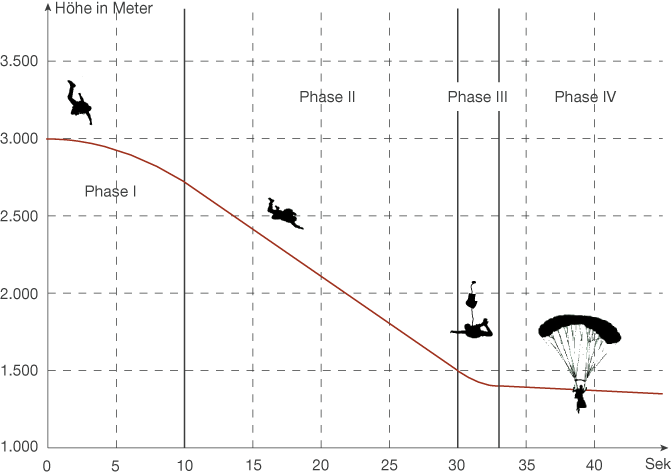Andreas möchte einen Fallschirmsprung durchführen. Er informiert sich vorher und findet eine Abbildung, die den Verlauf eines typischen Sprunges annähernd beschreibt. Bei diesem Sprung öffnet sich der Fallschirm in etwa