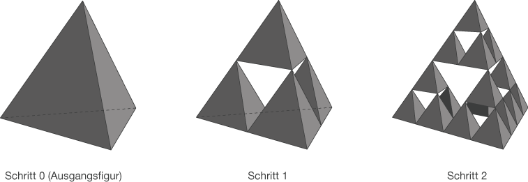 Bei jedem Schritt entstehen aus jedem Tetraeder vier kleinere Tetraeder. Die Anzahl setzt sich folgendermaßen zusammen: