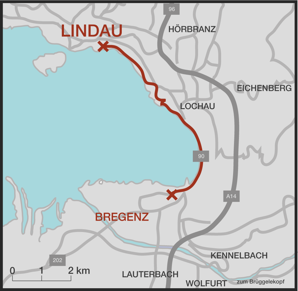 Die Strecke wird näherungsweise gemessen: Auf der Karte sind es von Lindau bis nach Bregenz etwa
