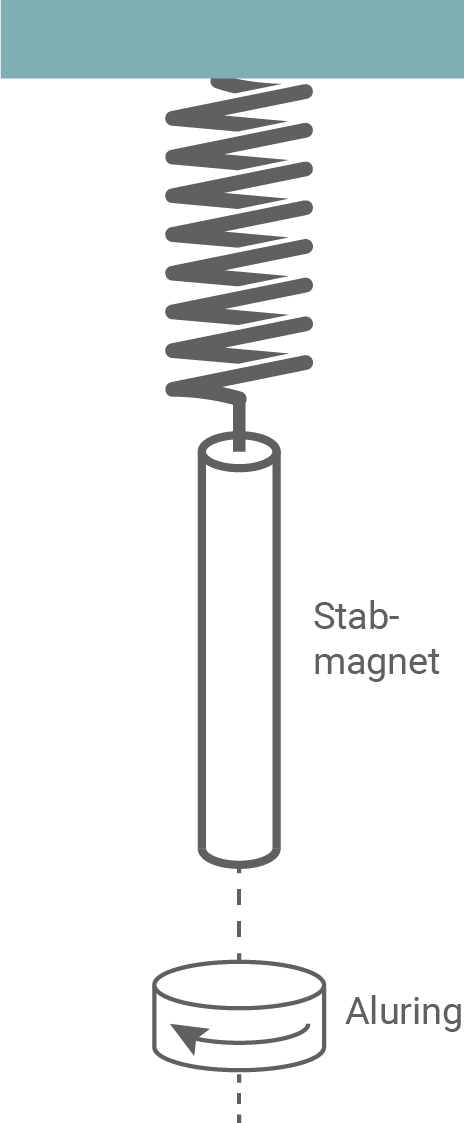 Ein Stabmagnet ist an einer Spiralfeder aufgehängt und kann in vertikaler Richtung reibungsfrei schwingen. Unterhalb des Magneten befindet sich ein fest angebrachter Aluminiumring (siehe Abbildung 3). Bei Annäherung des Stabmagneten an den Ring wird im Ring ein elektrischer Strom induziert, wobei sich die Elektronen in der in Abbildung 3 eingezeichneten Richtung bewegen.
