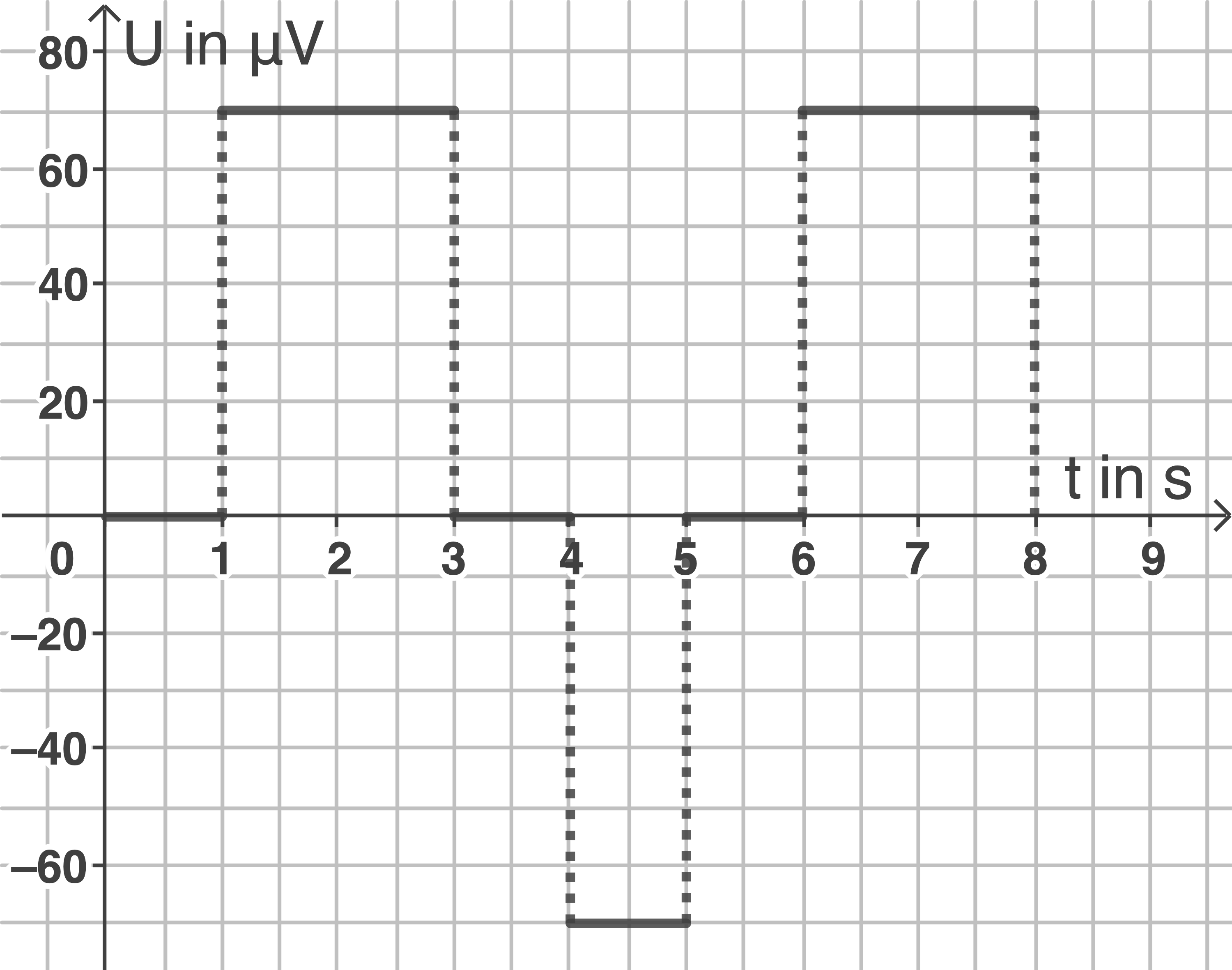 dauert es eine Sekunde, bis der Leiterrahmen den Feldbereich M1 erreicht. In den Intervallen [3s, 4s] und [5s, 6s] wird insgesamt keine Spannung induziert, da keine Flussänderung durch die Leiterschleife vorliegt. Nach 8s ist der Rahmen erstmals vollständig in den Feldbereich M2 eingetaucht. Es ergibt sich das folgende Schaubild: